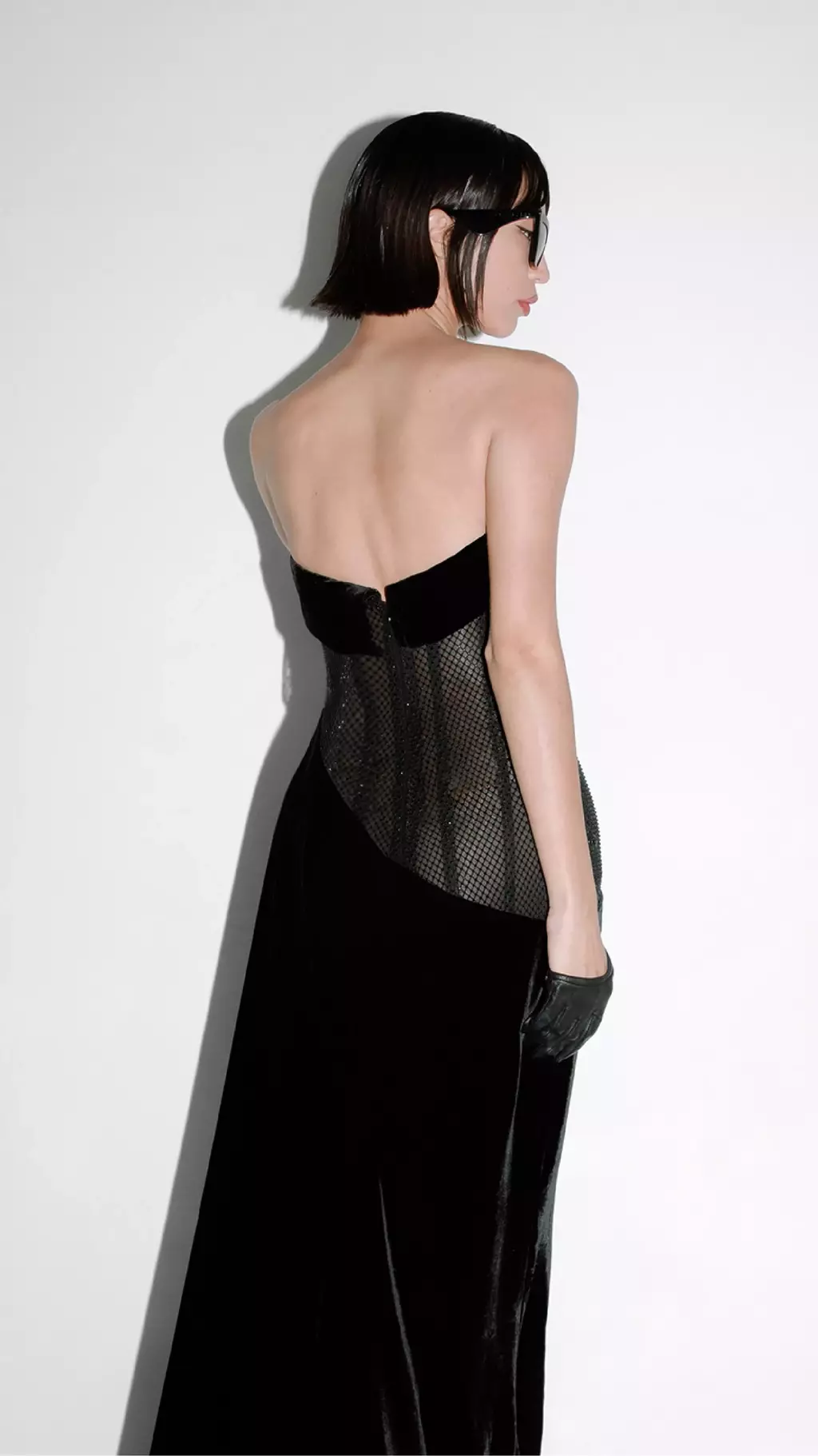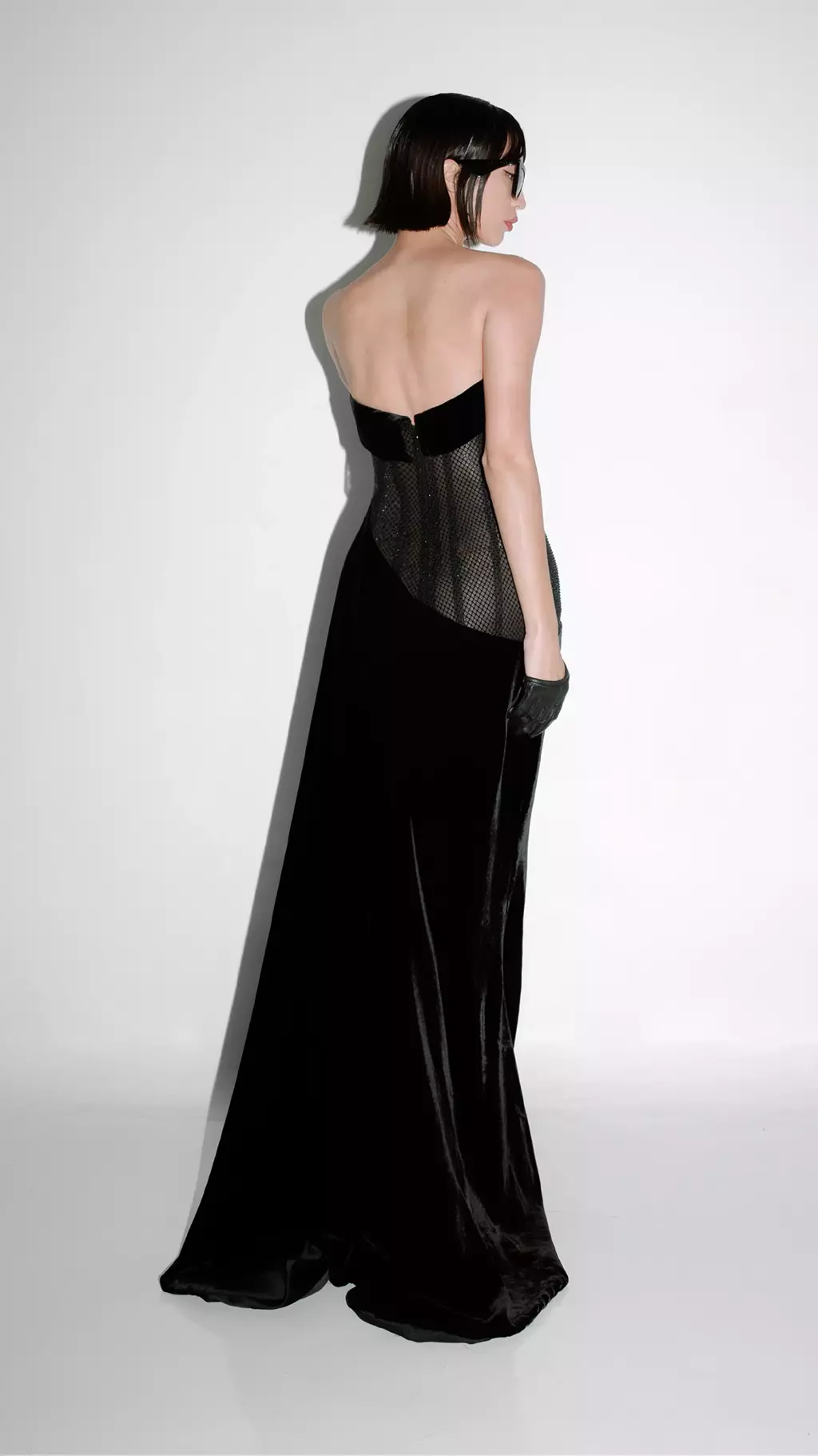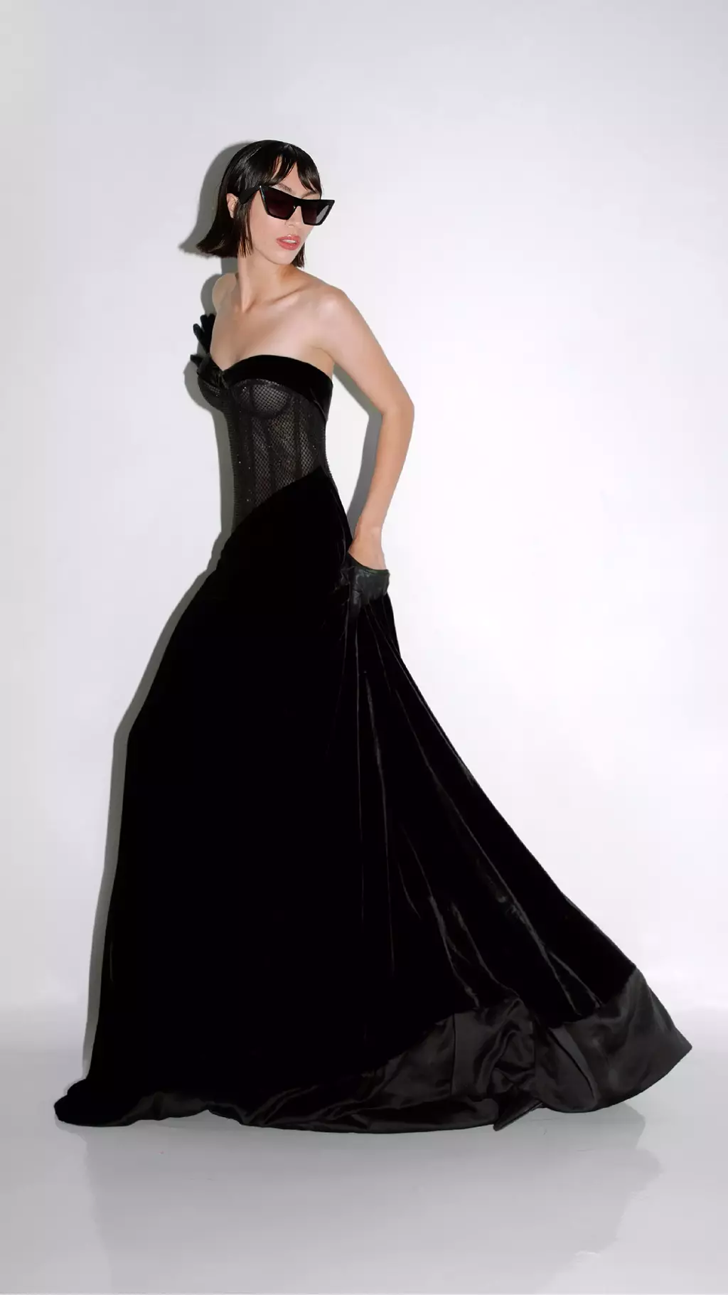 Vestido largo en tono Noir, realizado en mesh net con incrustaciones de cristales al tono y terciopelo de seda. Construcción corsetera de escote corazón y falda evasé asimétrica de caída al bies, con abertura lateral profunda y una bajada irregular en diagonal hacia la cadera.
