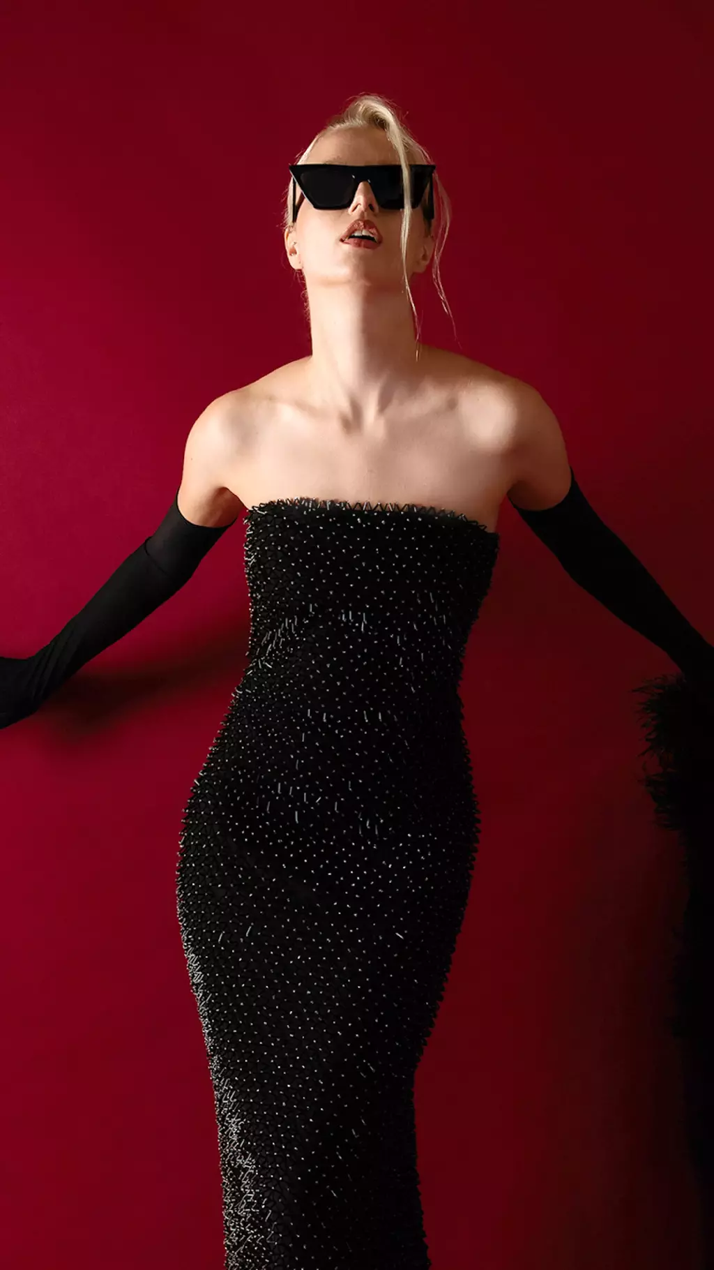 Vestido largo en tono noir, realizado en base de crépe italiano y tul bordado a mano con canutillos y cristales checoslovacos en diseño lineal. Construcción corsetera de escote strapless en U invertida, ballenas Rigilene y cintura ceñida. Falda semi evasé con caída al bies.