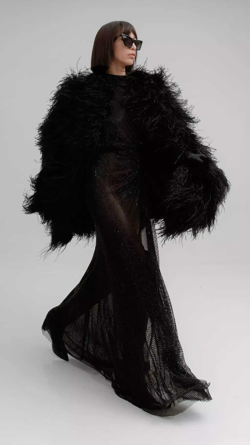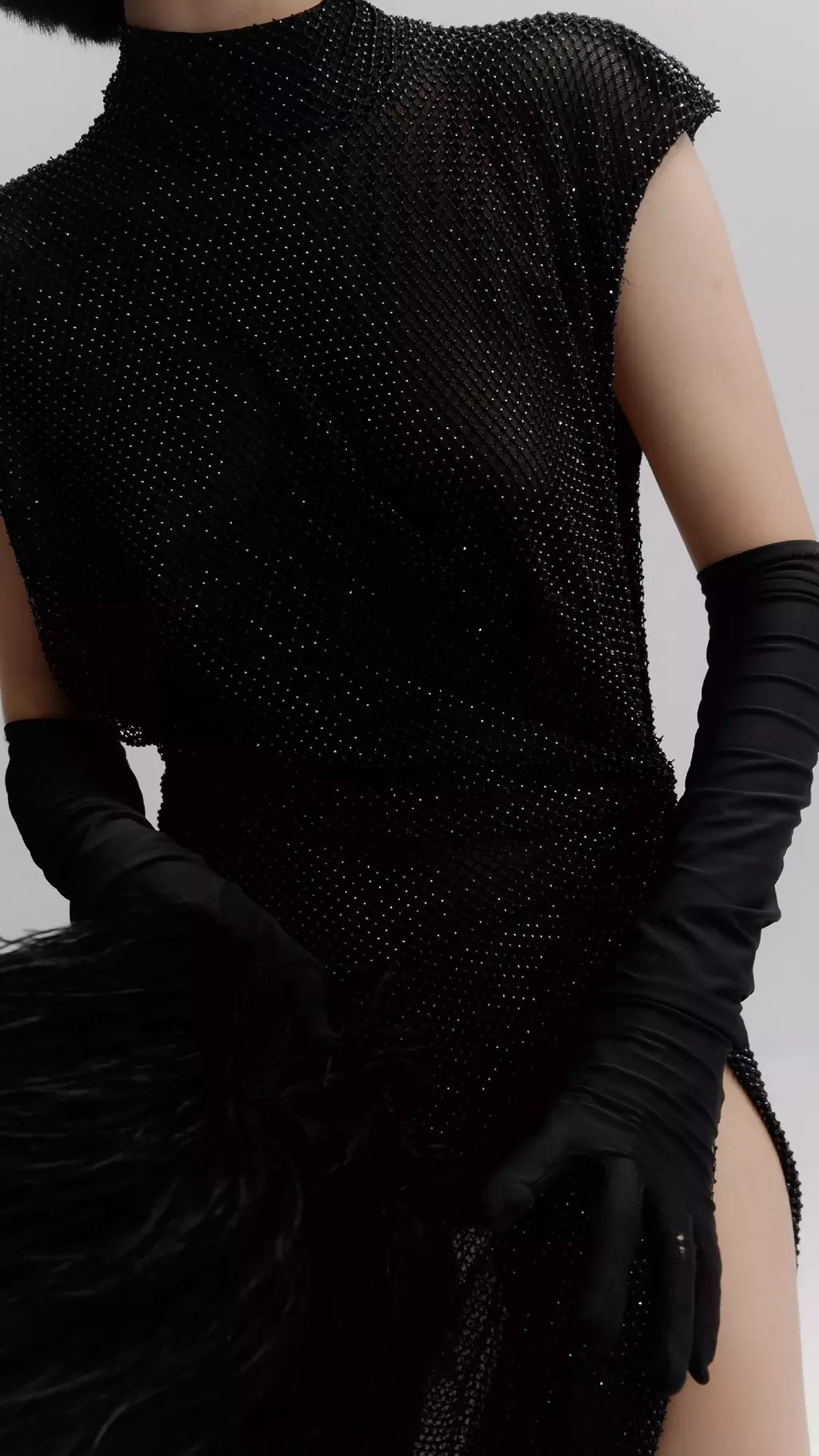 Vestido largo en tono noir, realizado íntegramente en mesh net con incrustaciones de cristales a tono. Construcción de cuello alto, hombros destacados y sisas cavadas. Espalda en corte tear profundo. Falda lápiz drapeada con abertura lateral profunda y sutil caída evasé, delineando la figura.
